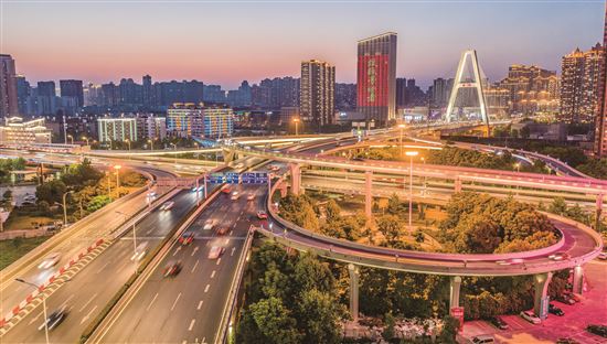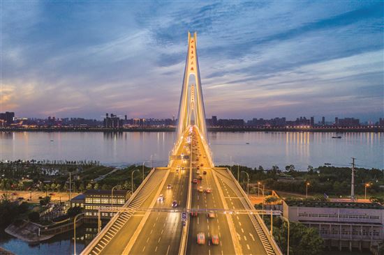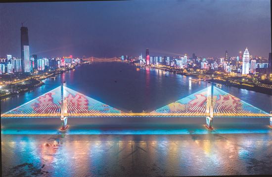 傍晚时分,武汉二七长江大桥灯光璀璨,车辆川流不息。