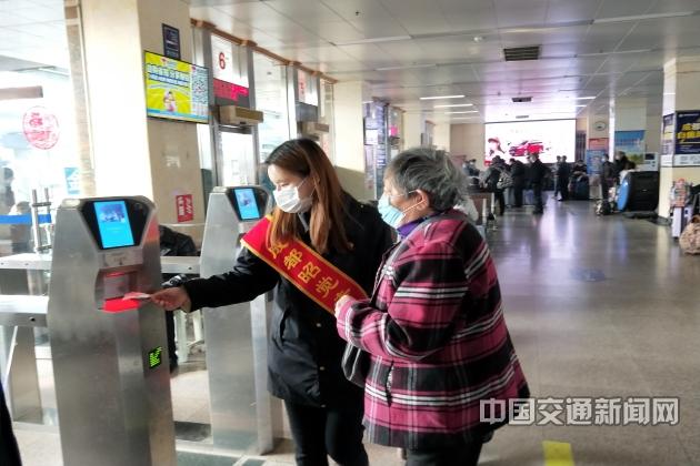 春运期间,四川成都各客运场站为无法运用智能技术的老年人等特殊群体提供人工便利服务,图为成都市昭觉寺汽车站工作人员帮助老人验票。