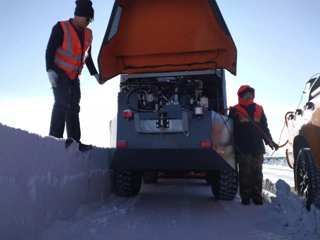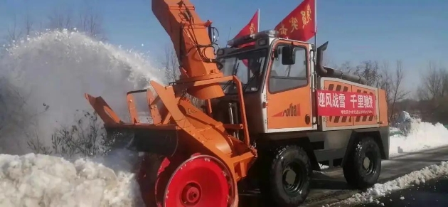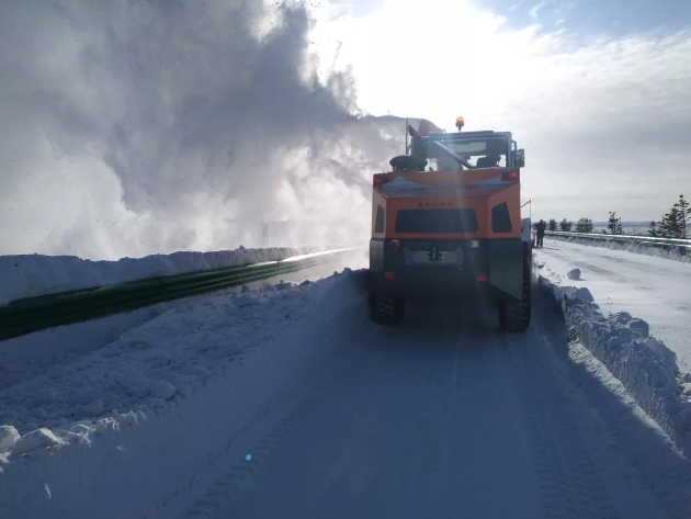 为尽快完成抢险保通工作,抢险突击队员24小时不间断作业。由于雪量大,路段长,随着气温回升,路段积雪不断融化,增加了除雪难度,但抢险突击队员们没有屈服和退缩,他们用除雪设备反复的推铲,面对深积雪,对除雪设备也是挑战,只能反复清除作业将雪不断抛到公路路基外侧,前进、倒车、抛出......一遍遍重复着操作动作。抛雪机的螺旋滚筒不时就被融化的积雪填满,队员们只能人工不断地进行清理,力争以最快的速度推进清雪任务,再对艰难路段进行攻坚。