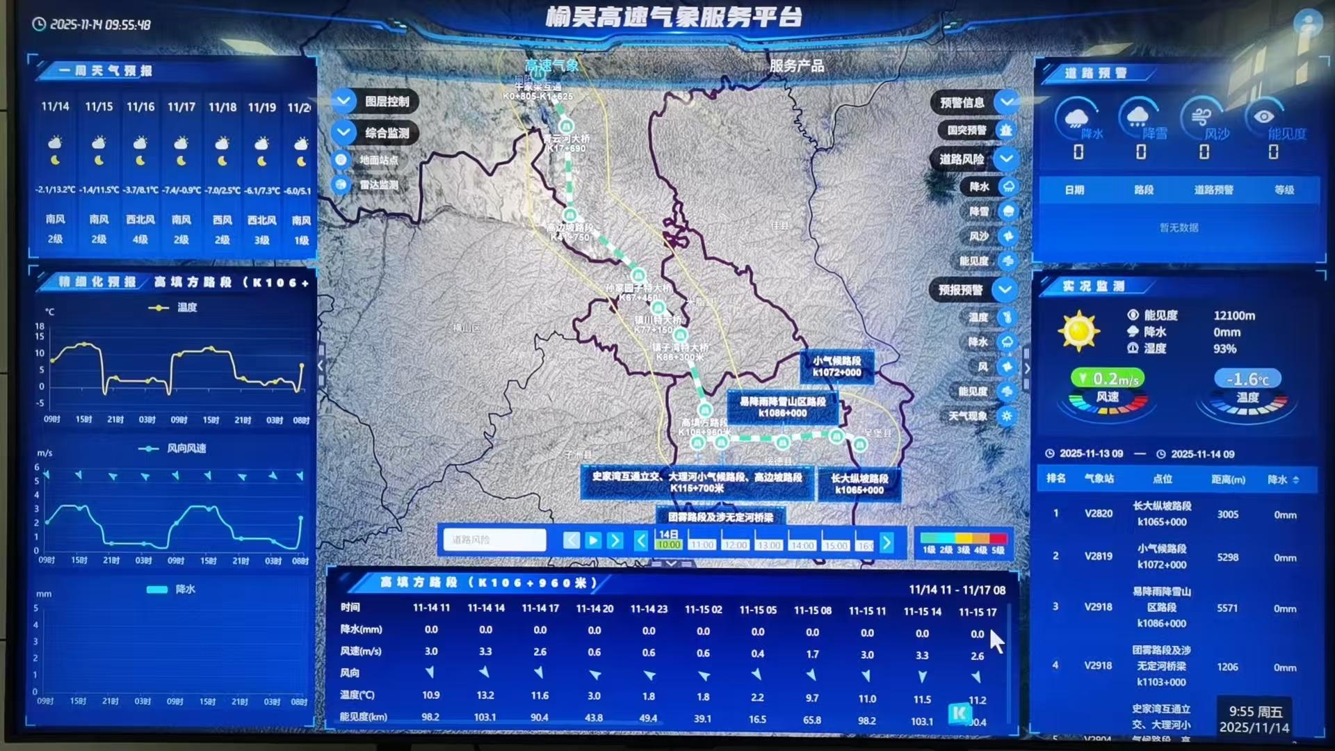 利用气象部门信息提醒和路段内12个天气监测预警点的实时上传信息,深入研判恶劣天气变化趋势,聚焦道路结冰、交通拥堵、车辆滞留等核心风险点,精准识别长大下坡、桥隧出入口等薄弱环节,提前制定防范应对措施,实现风险隐患早发现、早预警、早处置。