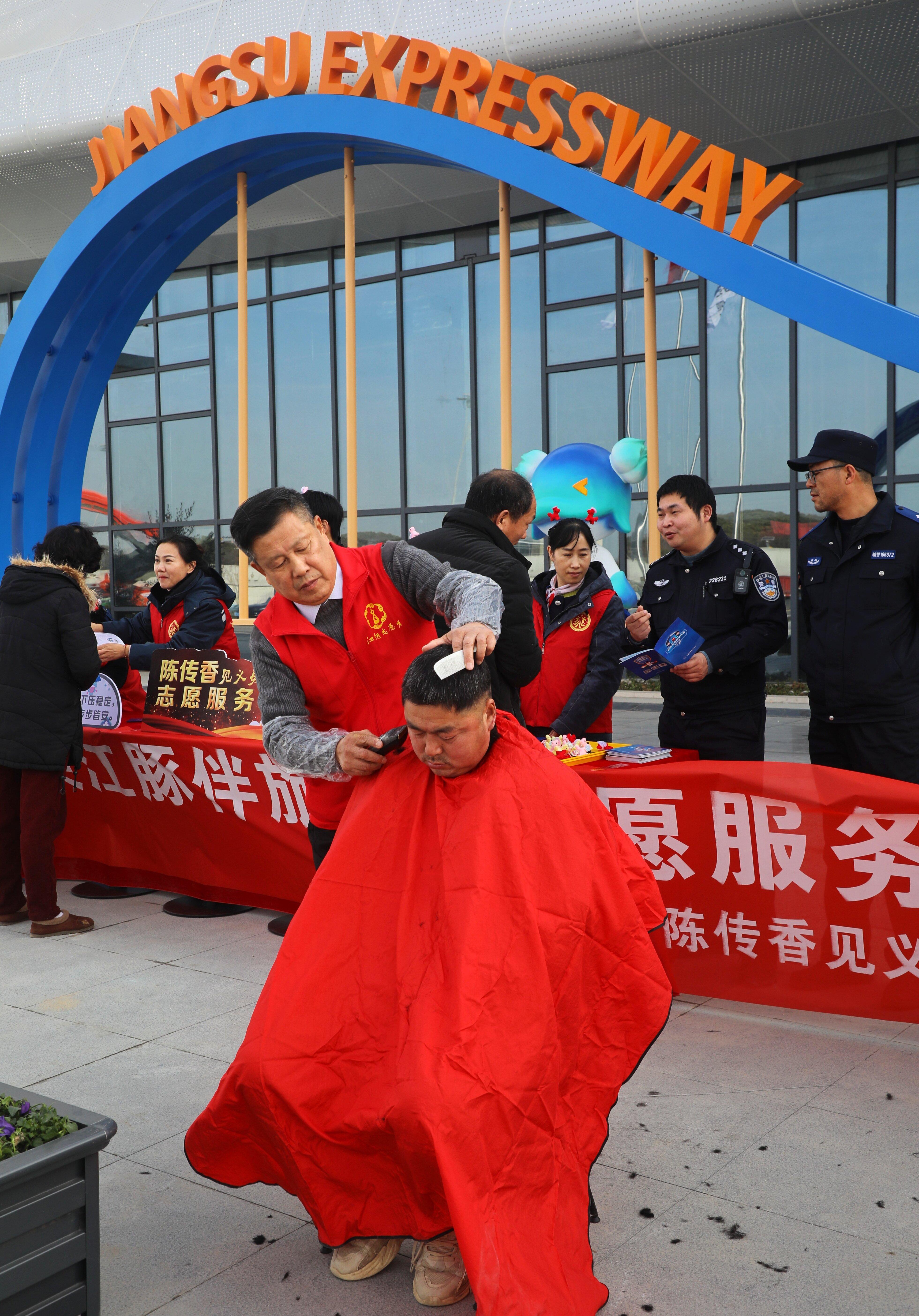 活动现场,“暖心服务台”分区明确,姜茶飘香、爱心义剪、健康监测、反诈宣传等服务活动各具特色。志愿者身着统一的志愿马甲,佩戴服务标识,笑容亲切,为往来司乘递上一杯杯热气腾腾的姜茶。“没想到在高速服务区还能喝到这么暖的茶,你们太用心了!”一位停车歇息的货车司机连声道谢。健康监测区前,不少旅客主动排队测量血压,志愿者一边记录一边轻声叮嘱注意事项;义剪区更是人气高涨,两位理发师手法娴熟,为风尘仆仆的司乘和一线施工、保洁人员修剪发型,带来焕然一新的旅途面貌。新桥镇派出所民警则通过案例讲解、发放资料等方式开展反诈宣传,提升公众出行安全意识。