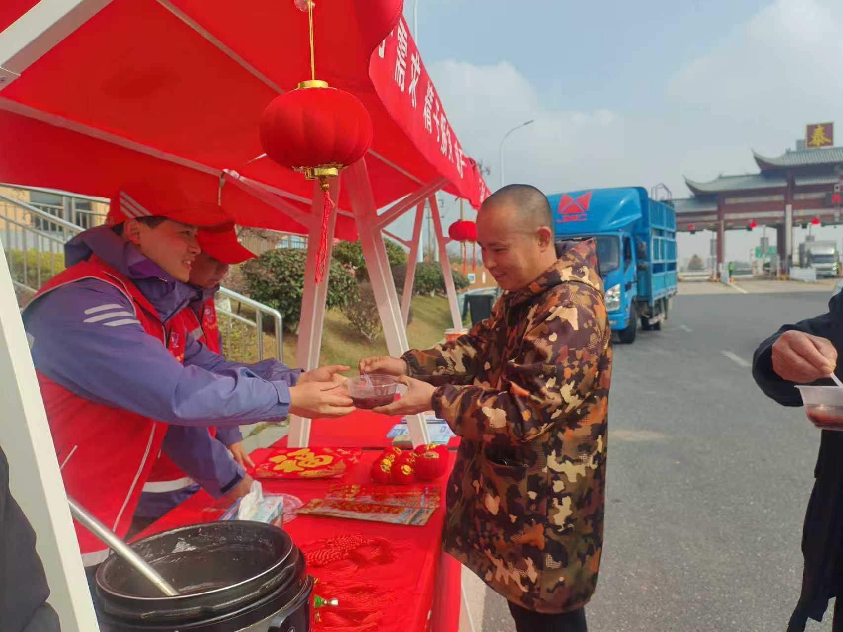 清晨,志愿者们将精心熬制的腊八粥一碗碗递到司乘手中,轻声叮嘱“小心烫”。粥香扑鼻,暖意流淌。“没想到在高速路口也能喝到这么地道的腊八粥,身上和心里都暖和了!”一位货车司机笑道。除了暖粥,工作人员还准备了出行对联、平安中国结等小礼物,赠予过往司乘,让节日的温馨在收费站广场蔓延。