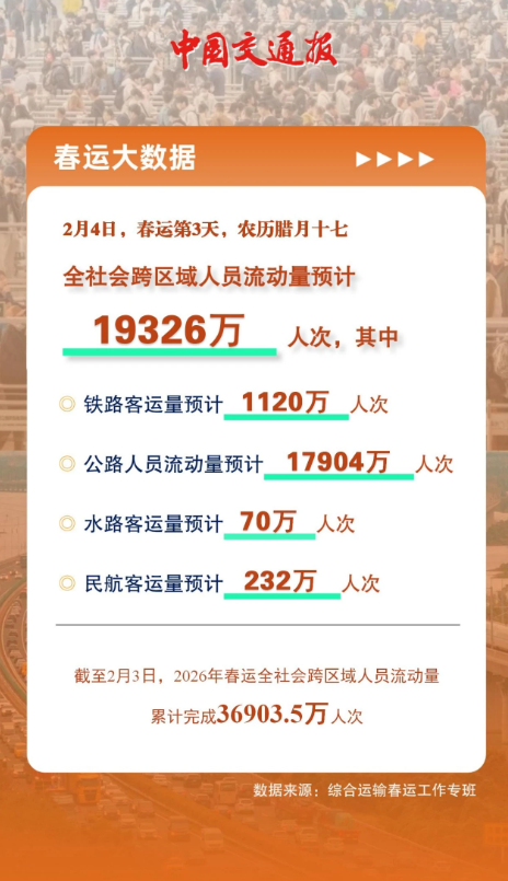 来自综合运输春运工作专班数据显示,预计2026年2月4日(春运第3日,农历腊月十七),全社会跨区域人员流动量19326万人次,其中🚩 铁路客运量预计1120万人次🚩 公路人员流动量预计17904万人次(高速公路及普通国省道非营业性小客车人员出行量预计14873万人次、公路营业性客运量预计3031万人次)🚩 水路客运量预计70万人次🚩 民航客运量预计232万人次截至2月3日,2026年春运全社会跨区域人员流动量累计完成36903.5万人次。