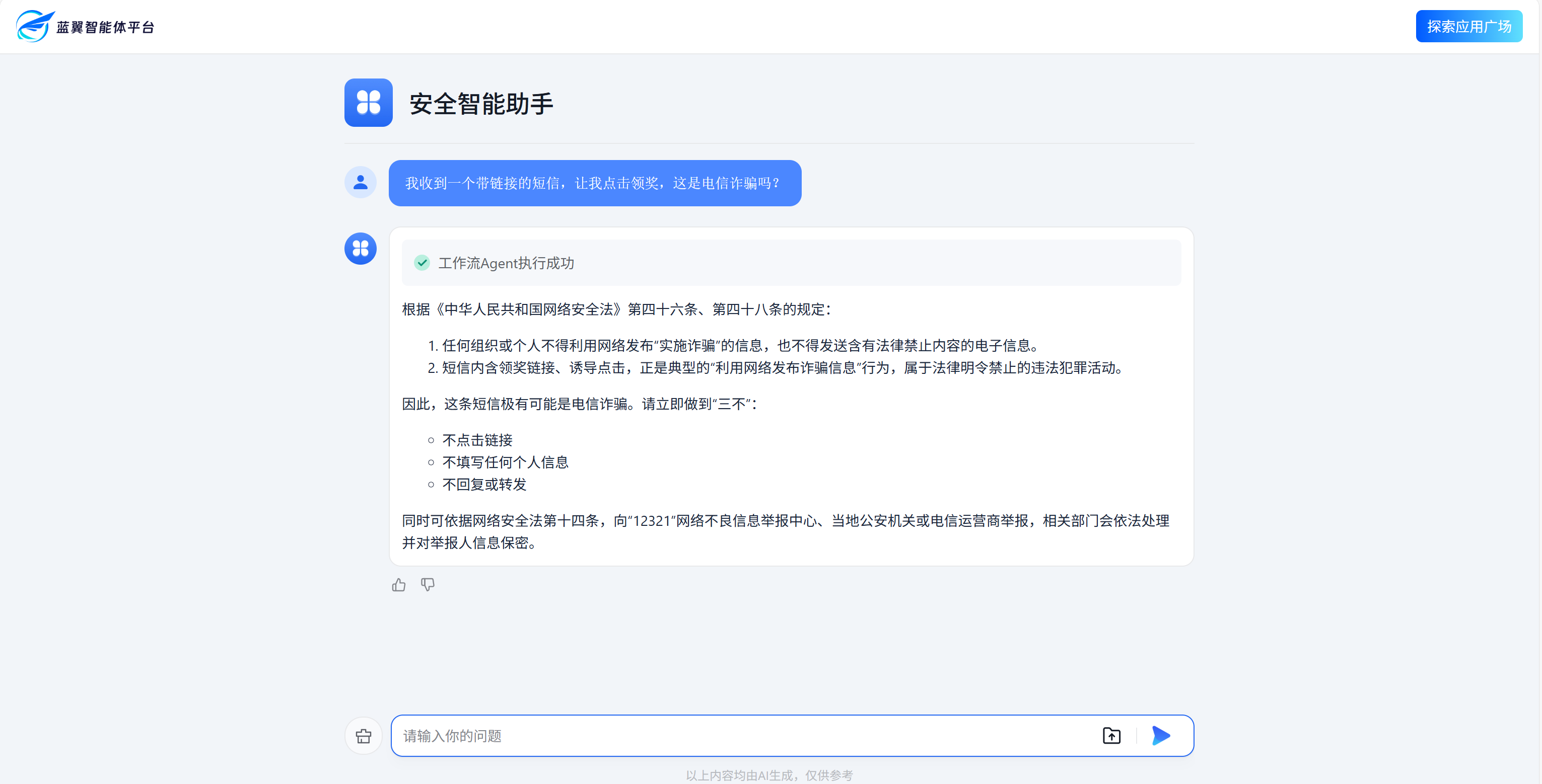 员工随问随答,筑牢个人安全意识“第一道防线”。2026年春运期间,员工出行奔波、岗位繁忙,面对隐蔽多变的网络威胁常生困惑。网安智能体采用问答即服务模式,为不同岗位员工提供即时精准的安全指导,让安全知识落地一线。