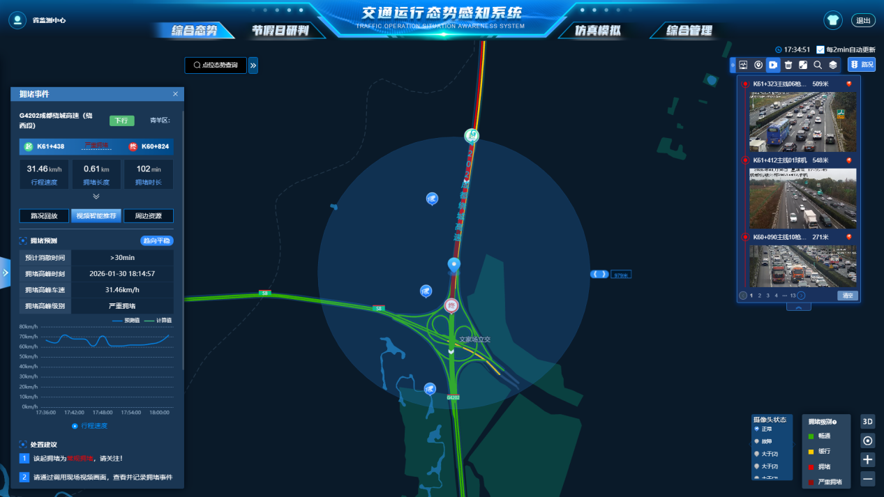 春运路网流量瞬息万变,智能公司依托四川省交通运输行业数字底座,为高速公路搭建“神经感知系统”,汇聚融合流量、速度、气象、视频等15类动态数据,形成基于智能体的路网实时态势感知与综合研判平台,精准捕捉路网细微变化、预判通行趋势,为调度决策筑牢基础。