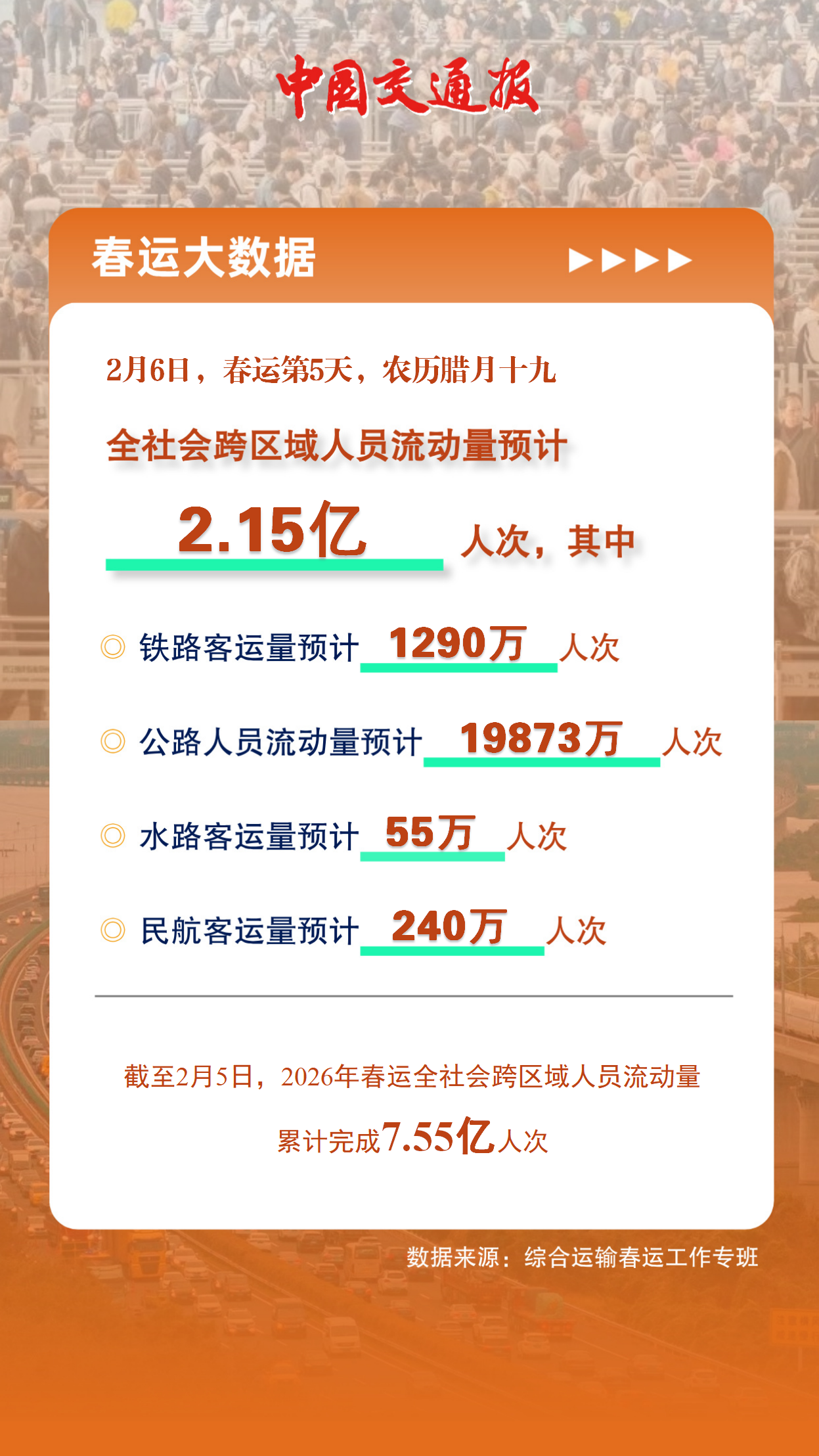 来自综合运输春运工作专班数据显示,预计2月6日(春运第5天,农历腊月十九),全社会跨区域人员流动量21458万人次,其中🚩铁路客运量预计1290万人次🚩公路人员流动量(高速公路及普通国省道非营业性小客车人员出行量预计16554万人次;公路营业性客运量预计3319万人次)🚩水路客运量预计55万人次🚩民航客运量预计240万人次截至2月5日,2026年春运全社会跨区域人员流动量累计完成75518万人次。