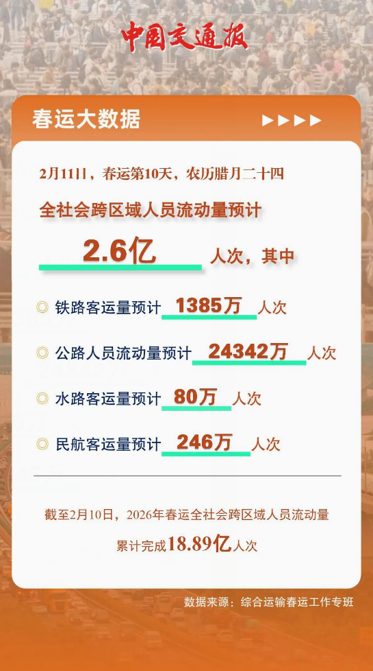 来自综合运输春运工作专班数据显示,预计2月11日(春运第10天,农历腊月二十四),全社会跨区域人员流动量26053万人次,其中🚩铁路客运量预计1385万人次🚩公路人员流动量预计24342万人次(高速公路及普通国省道非营业性小客车人员出行量预计20651万人次;公路营业性客运量预计3691万人次)🚩水路客运量预计80万人次🚩民航客运量预计246万人次截至2月10日,2026年春运全社会跨区域人员流动量累计完成188908.1万人次。