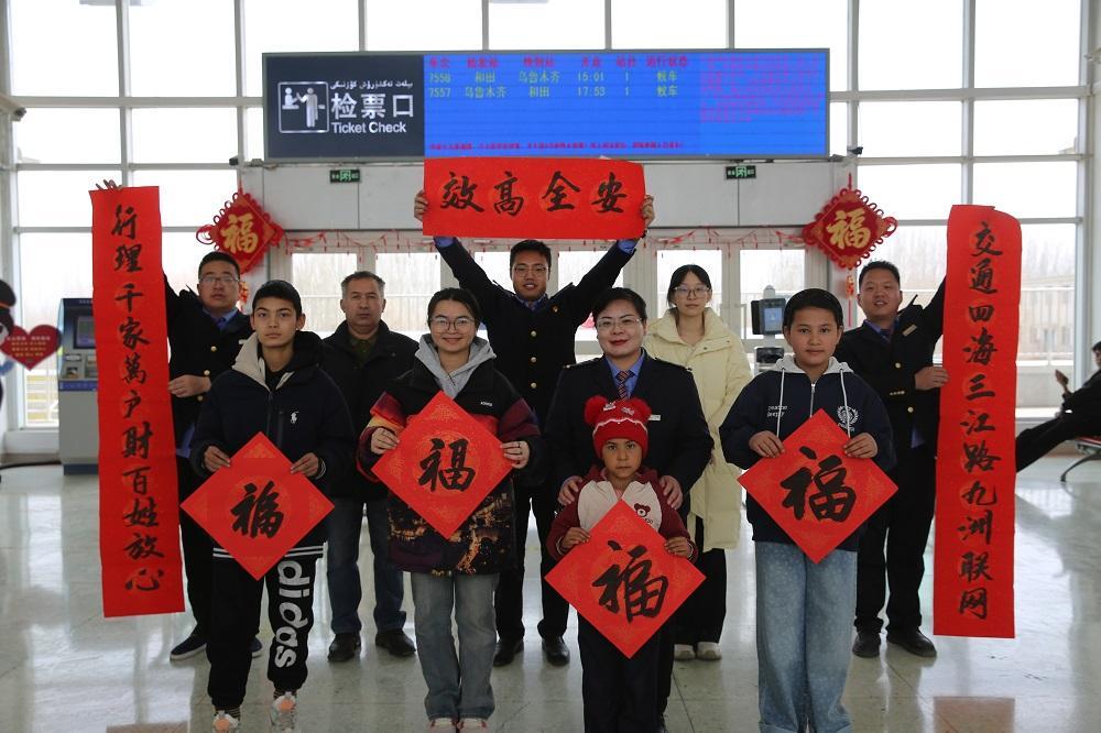 阿克陶站的年味不只在室内。站前广场上,红红的灯笼和中国结映着归乡的身影;候车室里,书法家与车站工作人员一同写春联、送福字。旅客李先生拿着刚写的“福”字笑得合不拢嘴:“没想到在这个小站感受到这么浓的年味儿!”