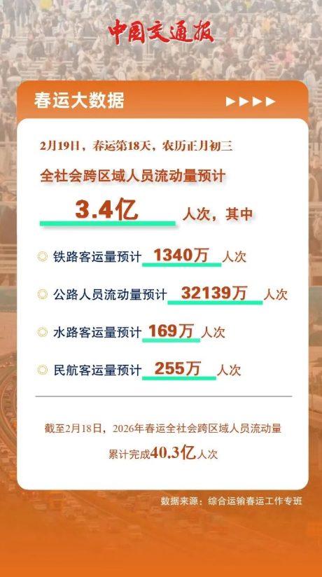 来自综合运输春运工作专班数据显示,2月19日(春运第18天,农历正月初三),全社会跨区域人员流动量预计33903万人次,其中🚩铁路客运量预计1340万人次🚩公路人员流动量预计32139万人次(高速公路及普通国省道非营业性小客车人员出行量预计29578万人次;公路营业性客运量预计2561万人次)🚩水路客运量预计169万人次🚩民航客运量预计255万人次截至2月18日,2026年春运全社会跨区域人员流动量累计完成402805.4万人次。