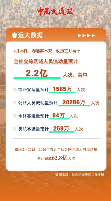 来自综合运输春运工作专班数据显示,预计2月26日(春运第25天,农历正月初十),全社会跨区域人员流动量22194万人次,其中🚩铁路客运量预计1565万人次🚩公路人员流动量预计20286万人次(高速公路及普通国省道非营业性小客车人员出行量预计17048万人次;公路营业性客运量预计3238万人次)🚩水路客运量预计84万人次🚩民航客运量预计259万人次截至2月25日,2026年春运全社会跨区域人员流动量累计完成628106.6万人次。