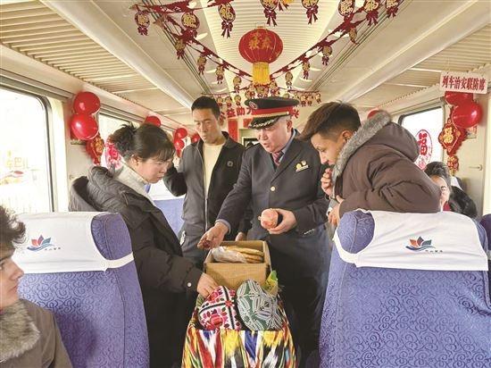 “大姐,您看看这红枣,是自家种的,甜得很!”“核桃便宜卖了,可以先尝后买!”“手工绣的花帽,给孩子戴刚合适!”……2月15日腊月廿八,春节假期首日,在和田开往乌鲁木齐的7558次“和田玉龙号”列车上,吆喝声、欢笑声、交谈声此起彼伏,列车长坡拉提汗一边维持秩序,一边帮农户递袋子、当翻译,车厢俨然是一个热闹的“流动巴扎”。