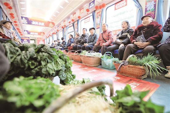 随着汽笛长鸣,5640次“慢火车”缓缓驶出贵阳站。车厢里,腊肉的咸香混着新鲜蔬菜的泥土气,歌声、笑声、吆喝声此起彼伏——这趟穿行在黔东南侗乡苗岭的“慢火车”,已是第八次化身为移动的“新春年货铺”。