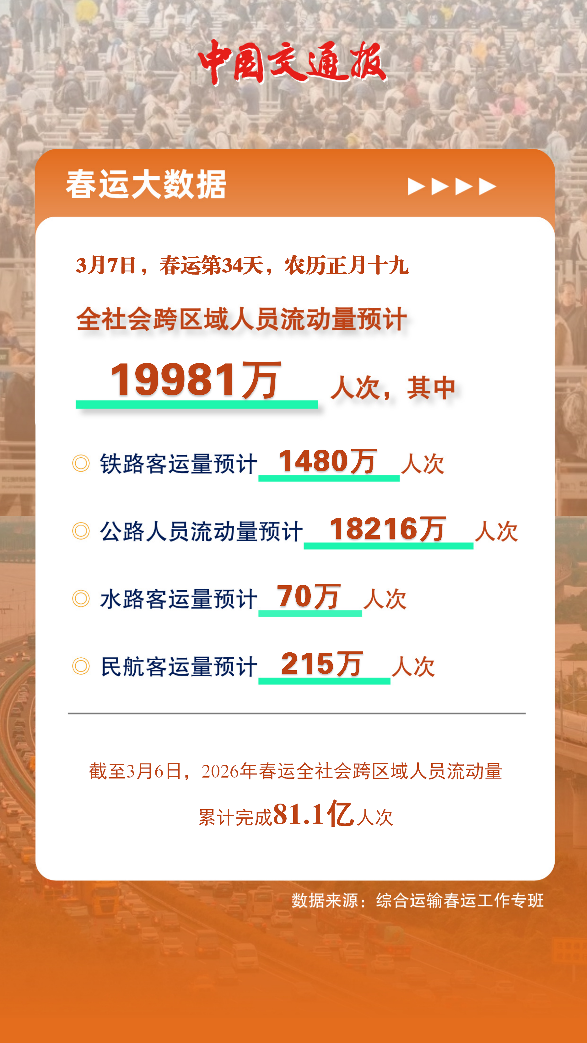 来自综合运输春运工作专班数据显示,预计3月7日(春运第34天,农历正月十九),全社会跨区域人员流动量19981万人次,其中