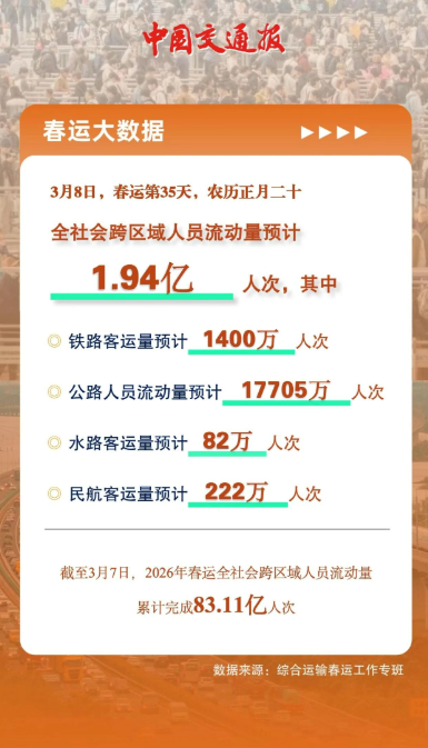 来自综合运输春运工作专班数据显示,预计3月8日(春运第35天,农历正月二十),全社会跨区域人员流动量19409万人次,其中🚩铁路客运量预计1400万人次🚩公路人员流动量预计17705万人次(高速公路及普通国省道非营业性小客车人员出行量预计14411万人次;公路营业性客运量预计3294万人次)🚩水路客运量预计82万人次🚩民航客运量预计222万人次截至3月7日,2026年春运全社会跨区域人员流动量累计完成831109.2万人次。